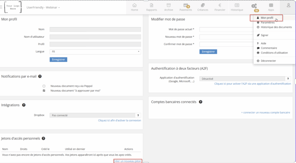 Pour générer un jeton d’accès dans Clearfacts, connectez-vous à votre compte, rendez-vous dans Mon Profil, puis cliquez sur Créer un nouveau jeton.